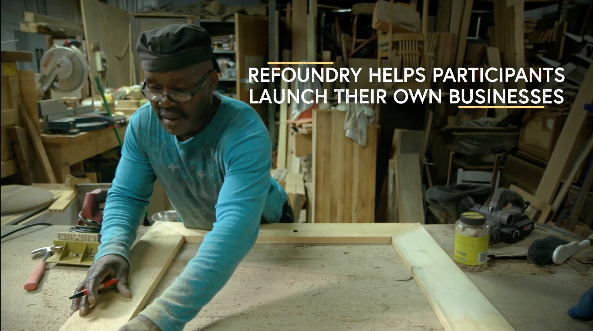 Refoundry trains formerly incarcerated people to repurpose discarded materials into home furnishings and mentors them into their own business and career path. Our curriculum includes mental health/addiction referrals, classes in internet, finance, business, resumé-building and interview skills, apprenticeships, business coaching and more.